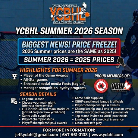 - Champions recieve a Cup / prizes and top teams qualify for the OBHF Provincials